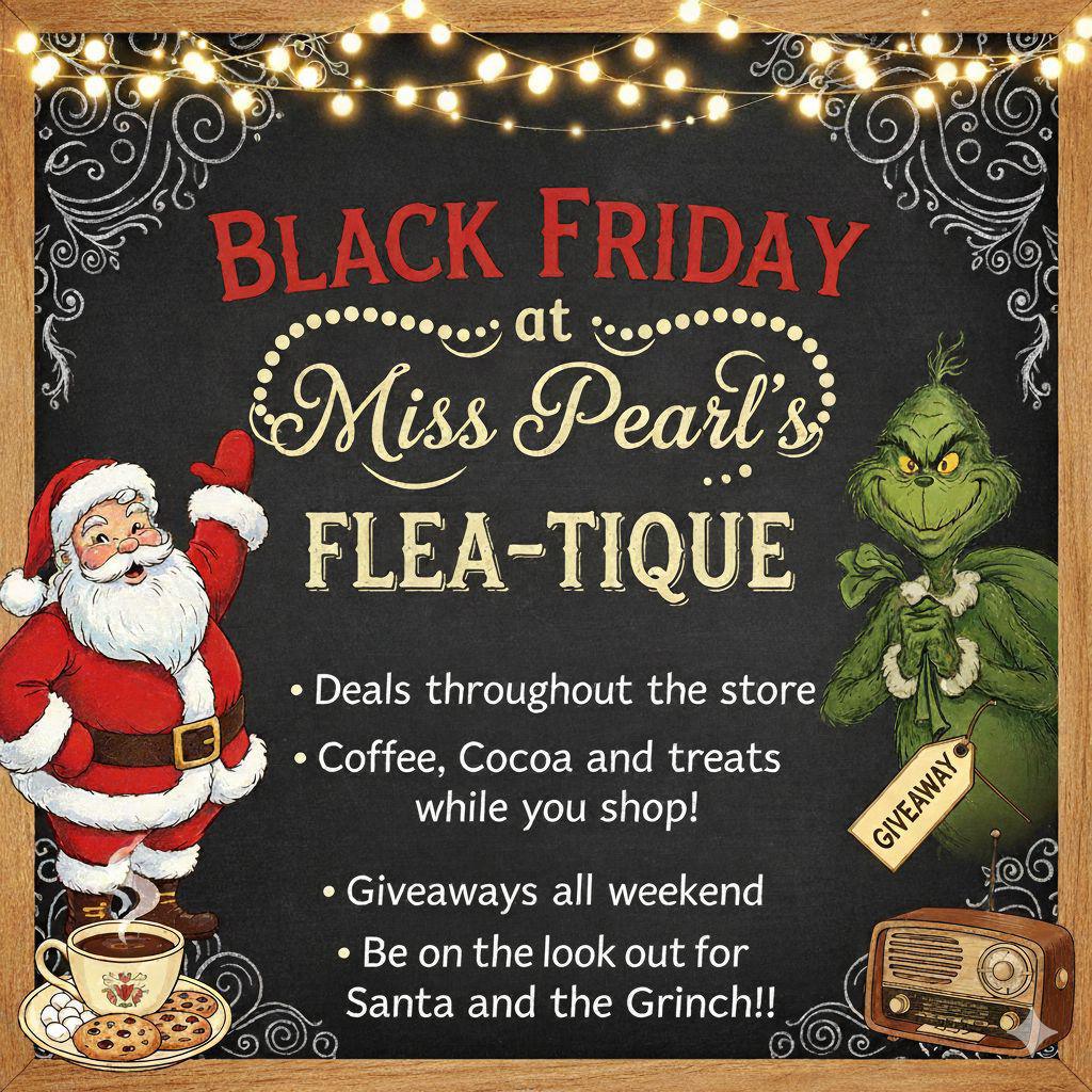 Come visit Miss Pearl’s Flea-tique for Black Friday! Opening at 7am, deals throughout the store. There will be treats and hot drinks! Keep an eye out for Santa and The Grinch!! Giveaways throughout the weekend!!