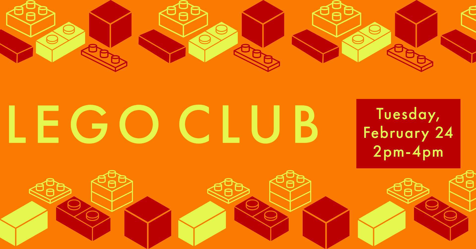 Kids 12 and under are invited to join us for LEGO Club on Tuesday, February 24 from 2pm-4pm in Andy's Storytime Room. LEGO Club is a self-guided program where kids can follow an instruction sheet or build something from their imagination. Legos will be provided by the library and will stay in the library. All creations will be torn apart at the end of the program, but photos can be taken and posted to the Library Facebook page to help show them off.