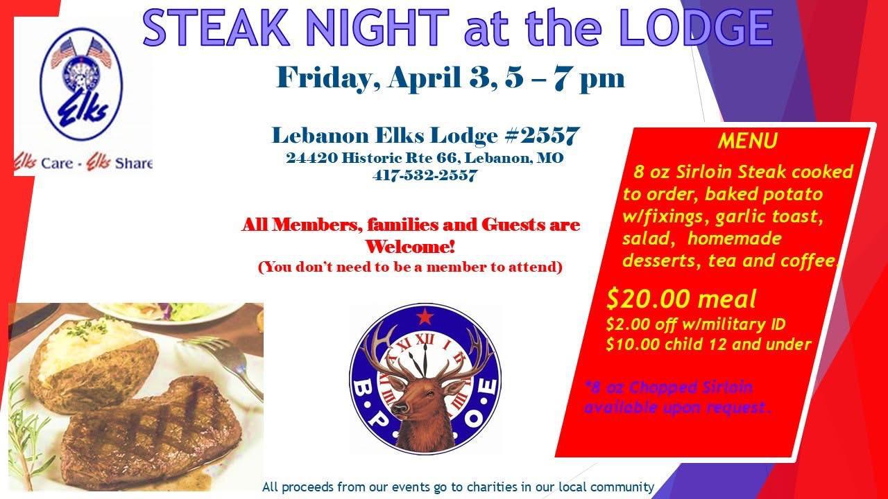 8 oz sirloin steak cooked to order, baked potato with fixings, salad, garlic toast, homemade desserts, tea, coffee for $20.00; children under 12 $10.00 and $2.00 off for veterans